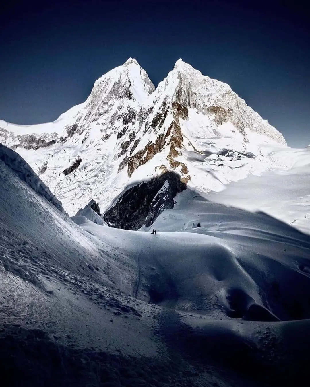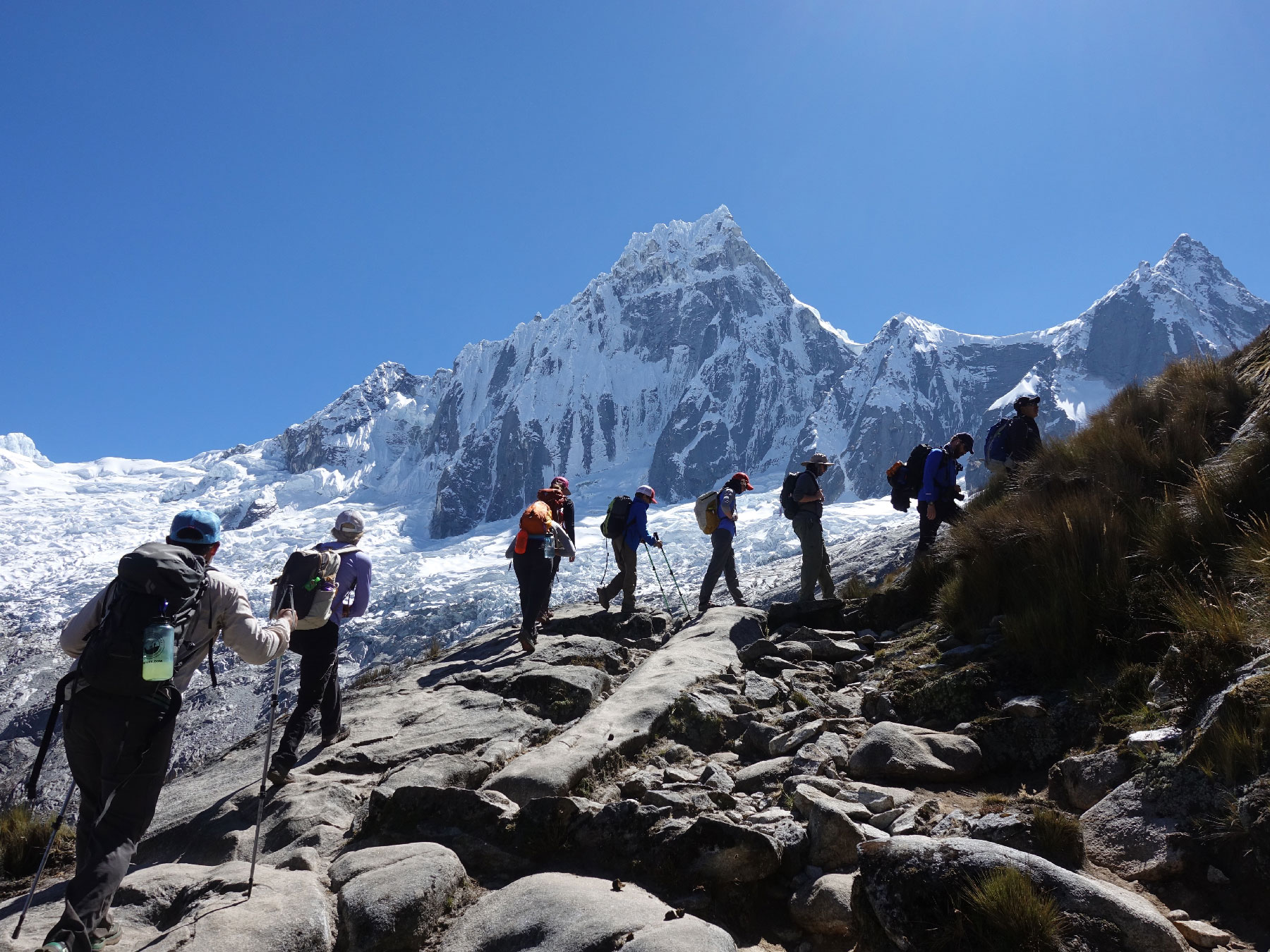 In der nächsten Etappe unserer Wanderung erreichen wir das «Refugio Perú», unser Basiscamp auf 4680 m. Der Ausblick auf die Rückseite des Nevado Huascarán und Chopicalqui ist überwältigend: Der Huascaran ist mit seinen 6768 Metern der höchste Berg Perus. Übernachtet wird in der Perú-Hütte. Wir geniessen die Aussicht auf die Huandoy-Gipfel, Chacraraju und Yanapaccha.